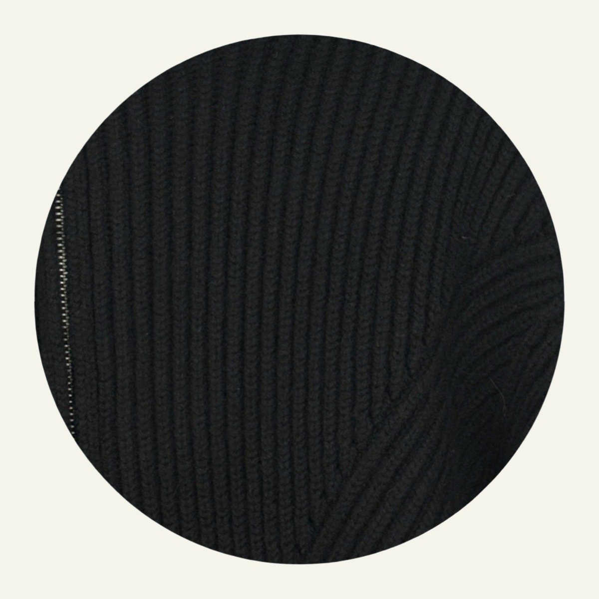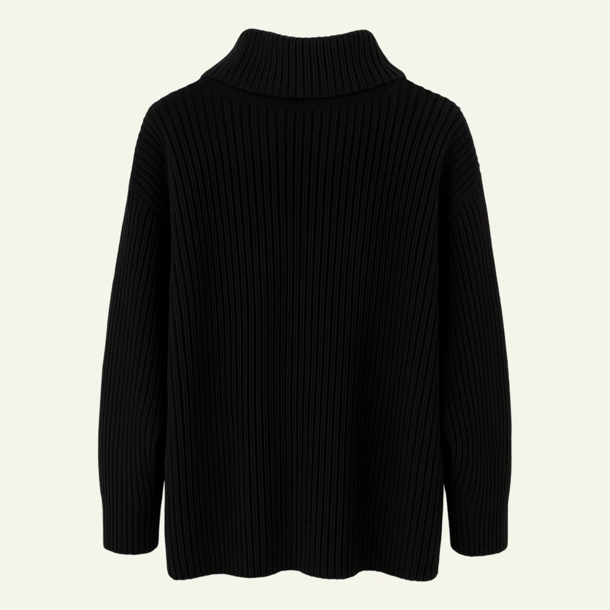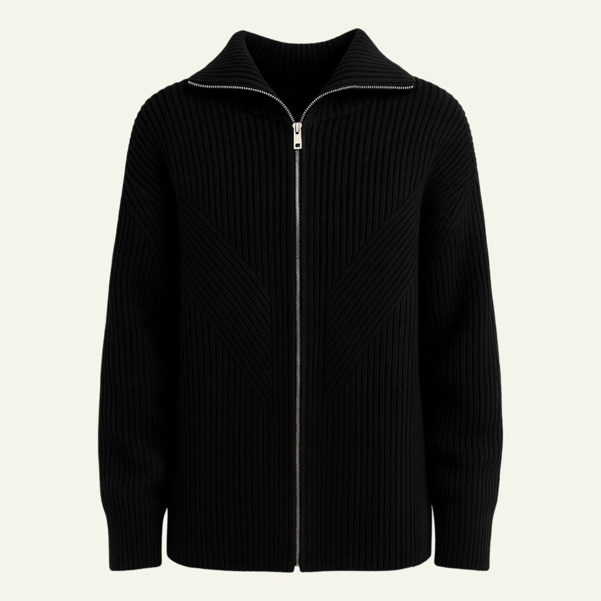 Cárdigan de punto en color negro con diseño acanalado, cierre de cremallera y cuello alto versátil. Una prenda atemporal que combina comodidad y estilo minimalista.