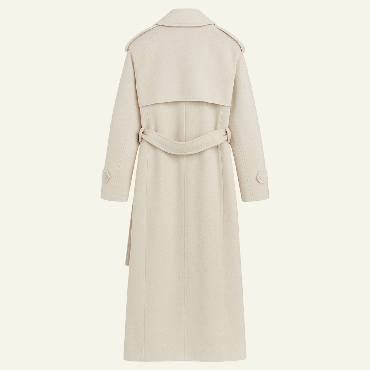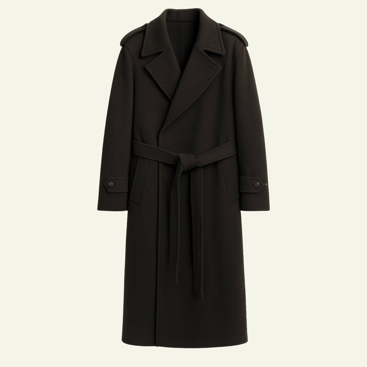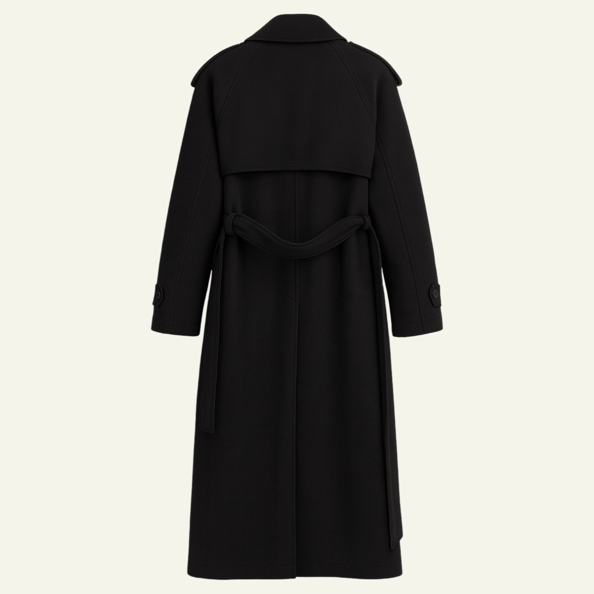 Abrigo largo clásico de Reondeu confeccionado en 70% algodón y 30% poliéster, disponible en negro y blanco. Corte recto y cinturón ajustable para un estilo atemporal y unisex.
