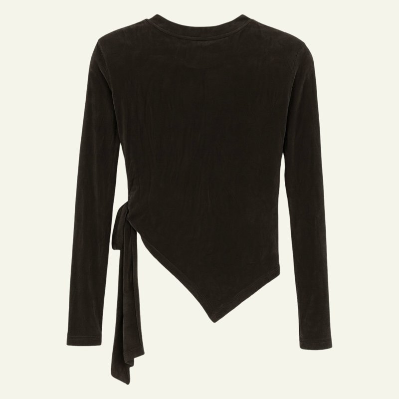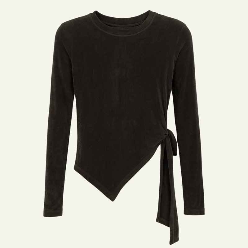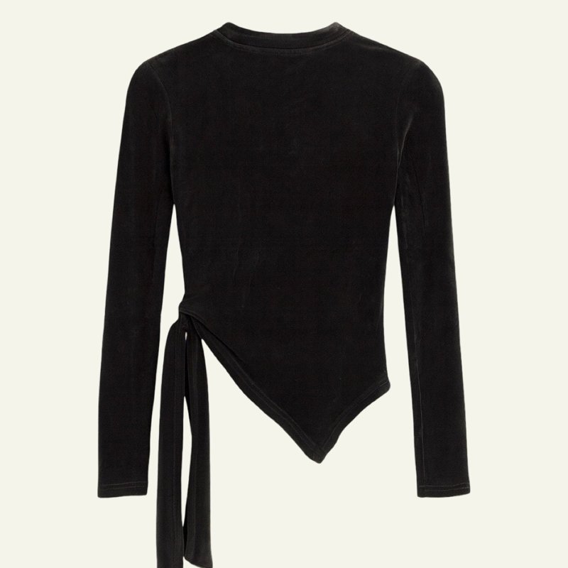 Camiseta de manga larga en terciopelo elástico, con diseño asimétrico y lazo lateral ajustable. Disponible en negro y gris oscuro